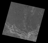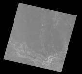 The basic Landsat imagery comes as three color filtered (red, green, blue) pictures with a color resolution of 768x768. A black and white (BW) version is also available with a resolution of 1536x1536. The imagery needs some color correction since each image can be from a very different date and time. Some clouds can obscure some areas and data gaps show as discolored bands.